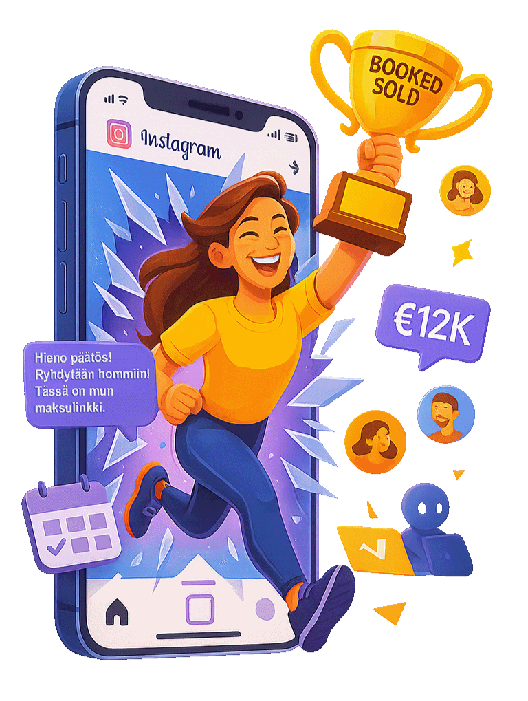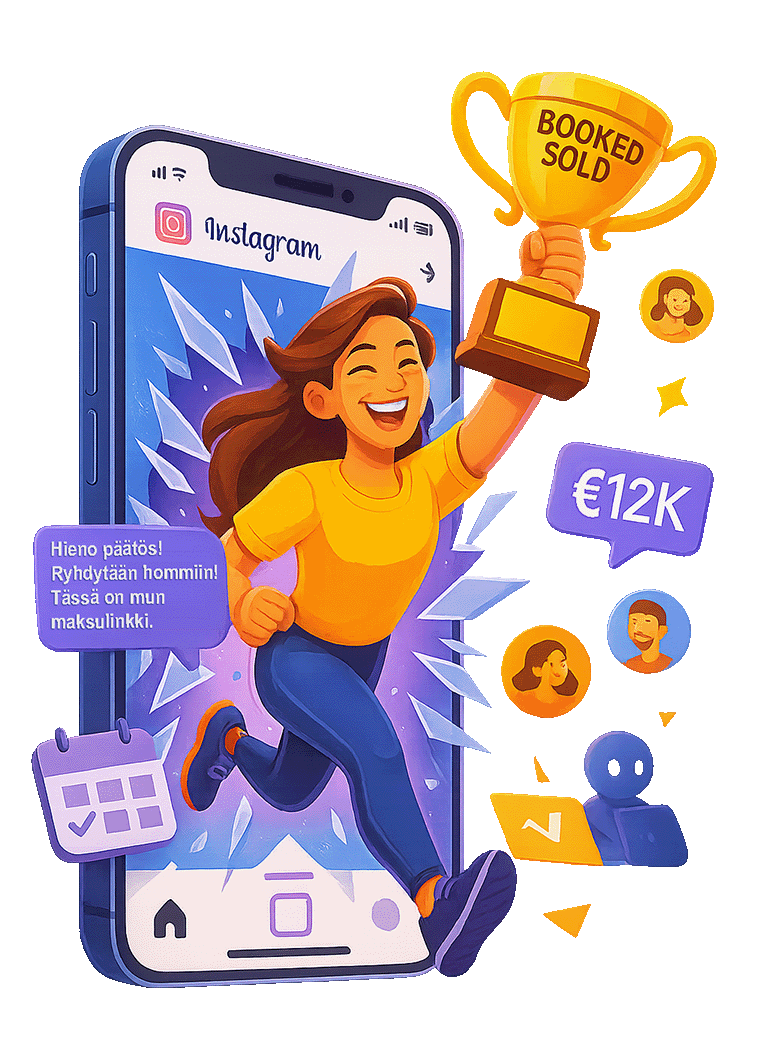 Me muutetaan se mitä teet jo nyt buukatuiksi asiakastapaamisiksi.❌ Ei algoritmipeliä ❌ Ei burnouttiaVain kauppaan johtavia DM:iä