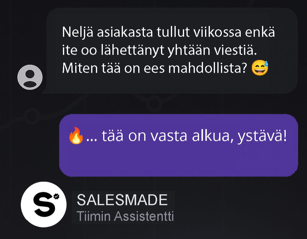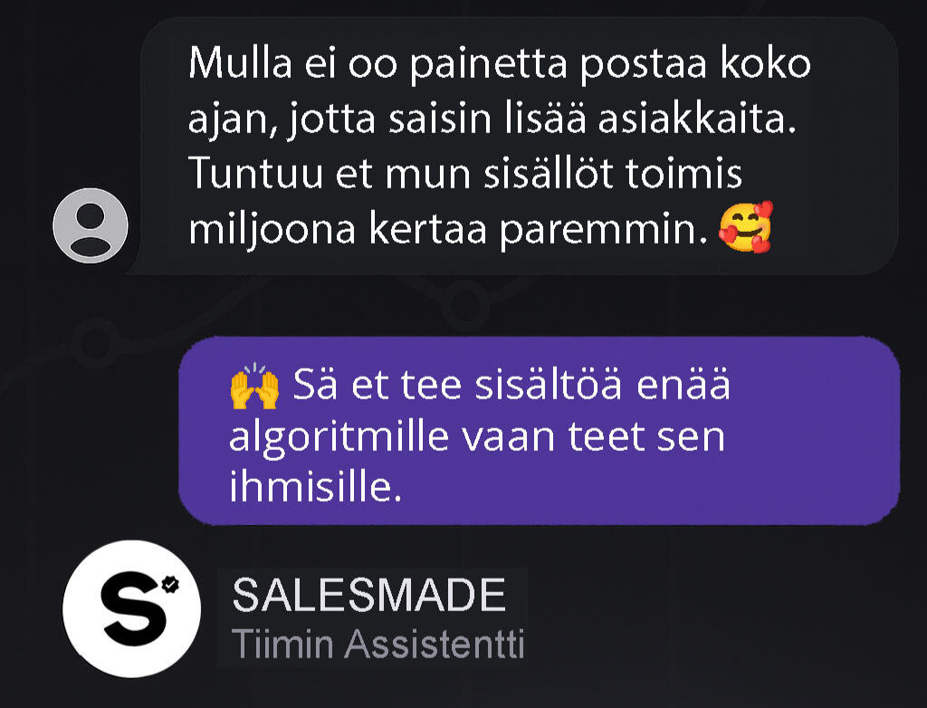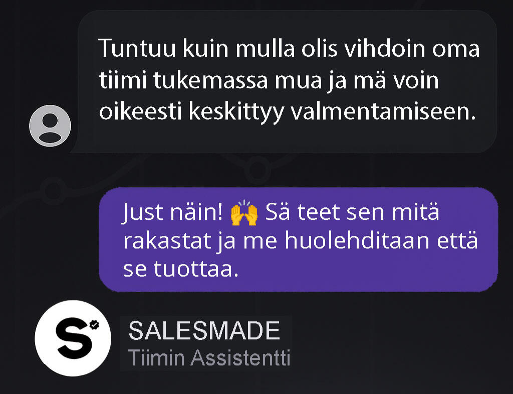 Olen työskennellyt satojen valmentajien kanssa, jotka muuttavat asiakkaidensa elämää – mutta ovat olleet vähällä menettää oman bisneksensä siinä samalla.Ei siksi, että he olisivat huonoja valmentajia. Vaan siksi, että heidän piti yhtäkkiä olla valmentajia sisällöntuottajia, myyjiä ja somemarkkinoijia – samaan aikaan.Kuulostaako tutulta?Sä aloitit valmentamisen, koska haluat auttaa ihmisiä. Et siksi, että halusit käyttää illat Keloihin ja Trainoihin, DM-viesteihin, kylmään muistutteluun olemassaolosta ja siihen fiilikseen, että "myynkö nyt liikaa?"Siksi rakensin SalesMade.ai:n.✅ Järjestelmä, joka kuulostaa sinulta